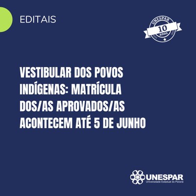 A Universidade Estadual do Paraná (Unespar), por meio da Diretoria de Registros Acadêmicos (DRA), da Pró-reitoria de Ensino de Graduação (Prograd), publicou a convocação de matrículas em primeira chamada para candidatos/as aprovados/as no XXII Vestibular dos Povos Indígenas no Paraná, para ingresso nos cursos de graduação da Unespar. As solicitações de matrículas acontecem de forma online até o dia 5 de junho, por meio do site unespar.edu.br/matriculas.