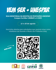 Você está aqui: Página Inicial > Notícias > 2025 > Julho > INSCRIÇÕES DE MONITORES PARA A MOSTRA DE PROFISSÕES UNESPAR - CAMPUS I E II (EMBAP e FAP) 27 E 28 DE AGOSTO VEM SER + UNESPAR