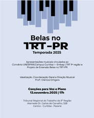 No dia 13 de novembro de 2025 (quinta-feira) as 17h acontecerá o sétimo concerto da temporada 2025 do projeto de extensão Belas no TRT-PR vinculado ao convênio de cooperação cultural Tribunal Regional do Trabalho do Paraná e a UNESPAR/Campus Curitiba I - Embap.