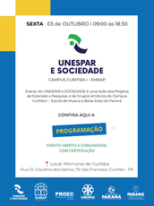 A Universidade Estadual do Paraná (Unespar), Campus Curitiba I – EMBAP (Escola de Música e Belas Artes do Paraná), realiza nesta sexta-feira, 03 de outubro de 2025, o evento “UNESPAR e Sociedade”, no Memorial de Curitiba (Rua Dr. Claudino dos Santos, 79 – São Francisco). A iniciativa acontece das 09h às 18h30, com entrada gratuita, certificação para participantes e atividades abertas à comunidade..